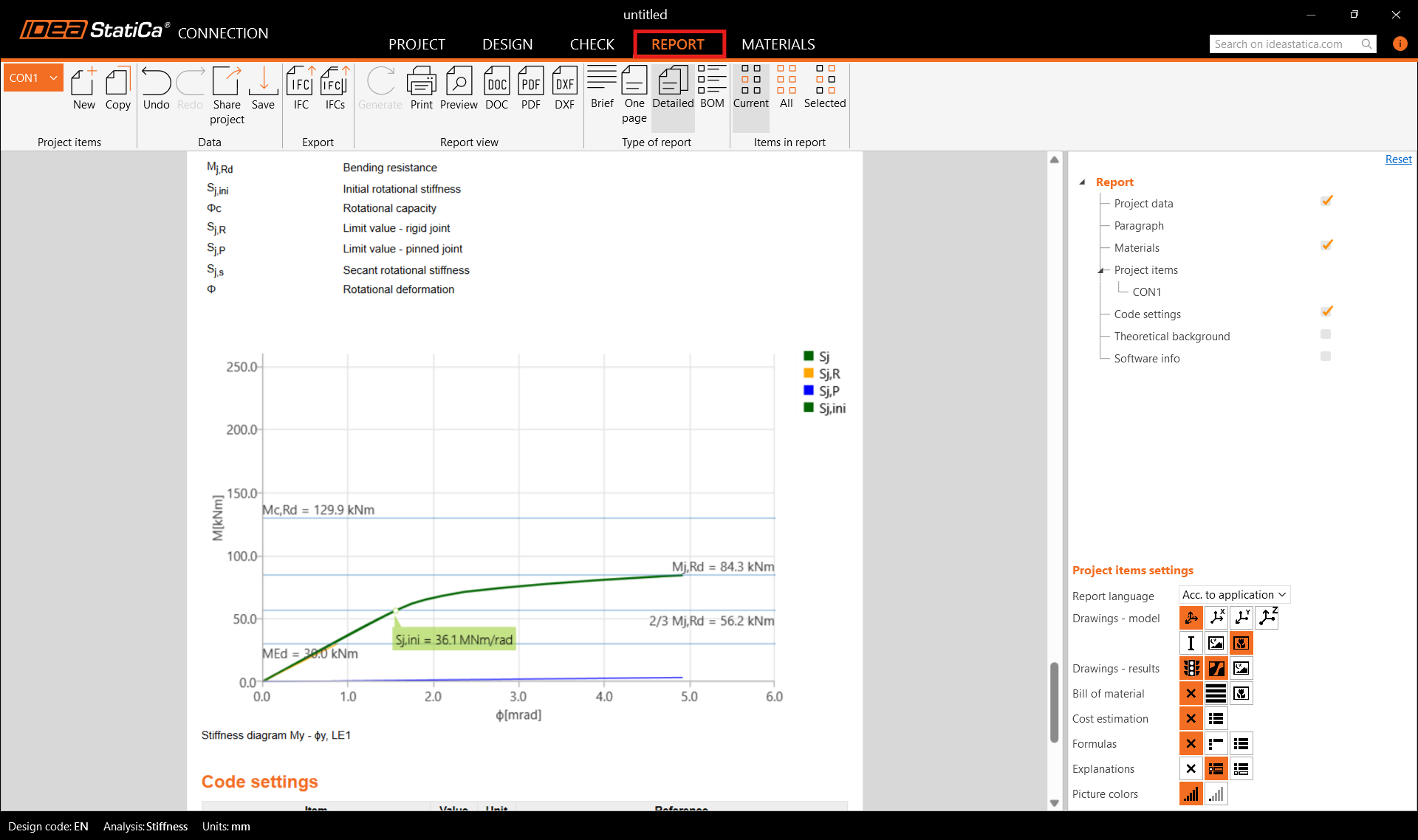 As the last step, go to the tab Report. IDEA StatiCa offers a fully customizable report to print out or save in an editable format.