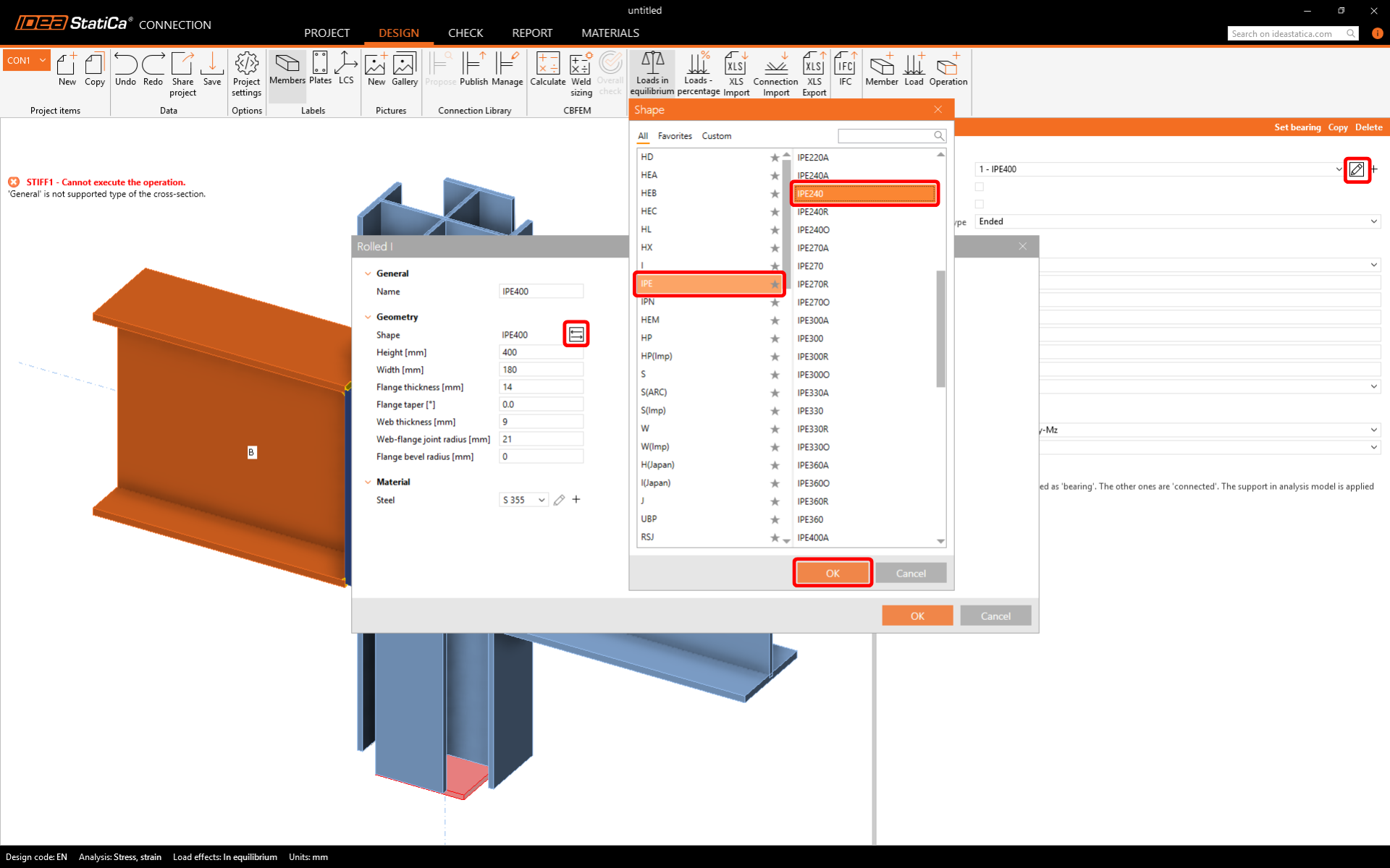 Make sure that the stiffener operation is deactivated, and adjust thickness, dimensions and position of bolts of the end plate EP1.