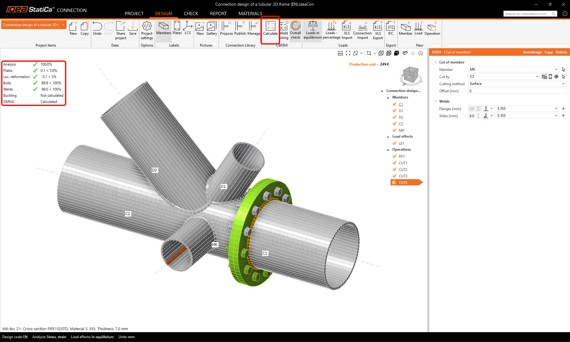 Start the analysis by clicking Calculate in the ribbon. The analysis model is automatically generated, the calculation based on CBFEM is performed, and we can see the Overall check displayed together with the basic values of check results.