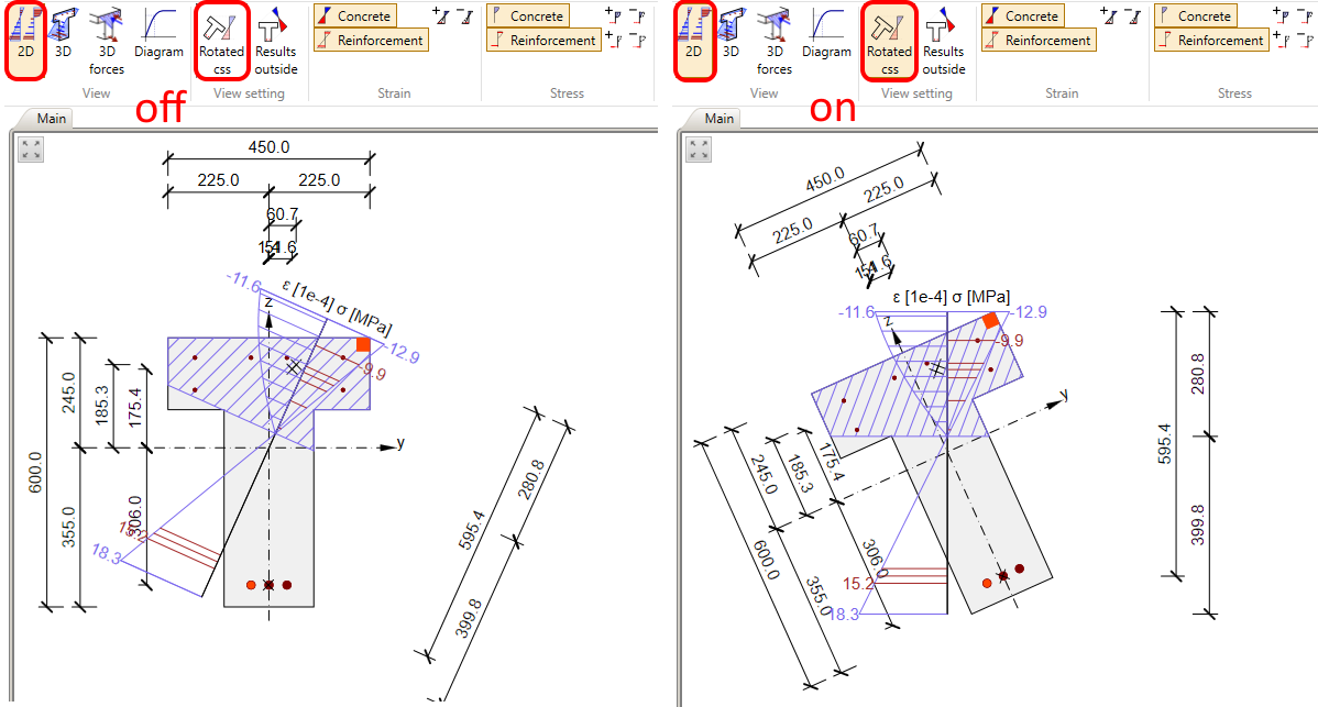 You can switch between them on the top ribbon. In the previous figure, the 2D displaying option was shown. If the option is selected, you can display a rotated cross-section or rotated results.