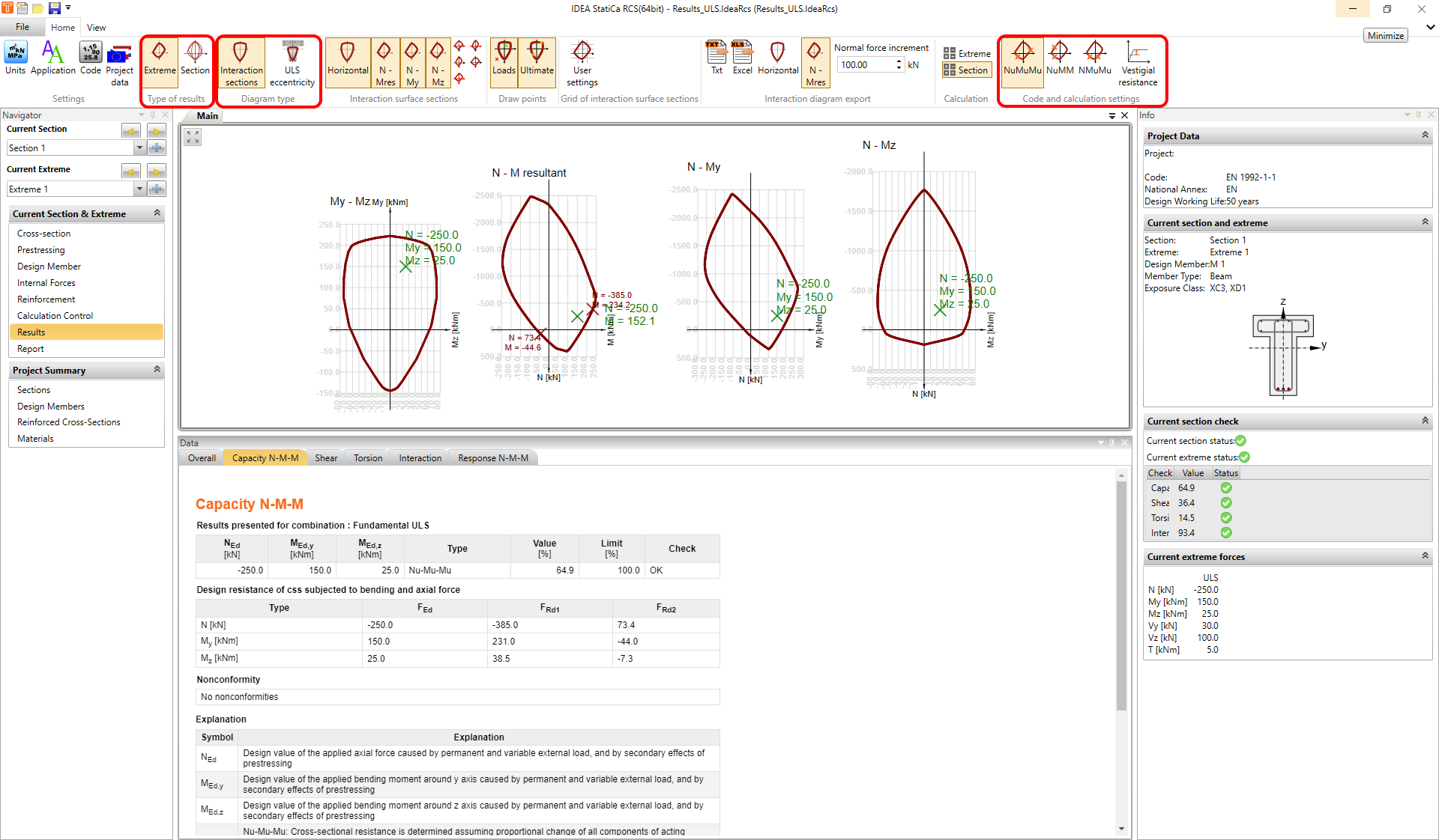 ULS results in RCS - Capacity N-M-M, Shear, Torsion, Interaction, Response N-M-M