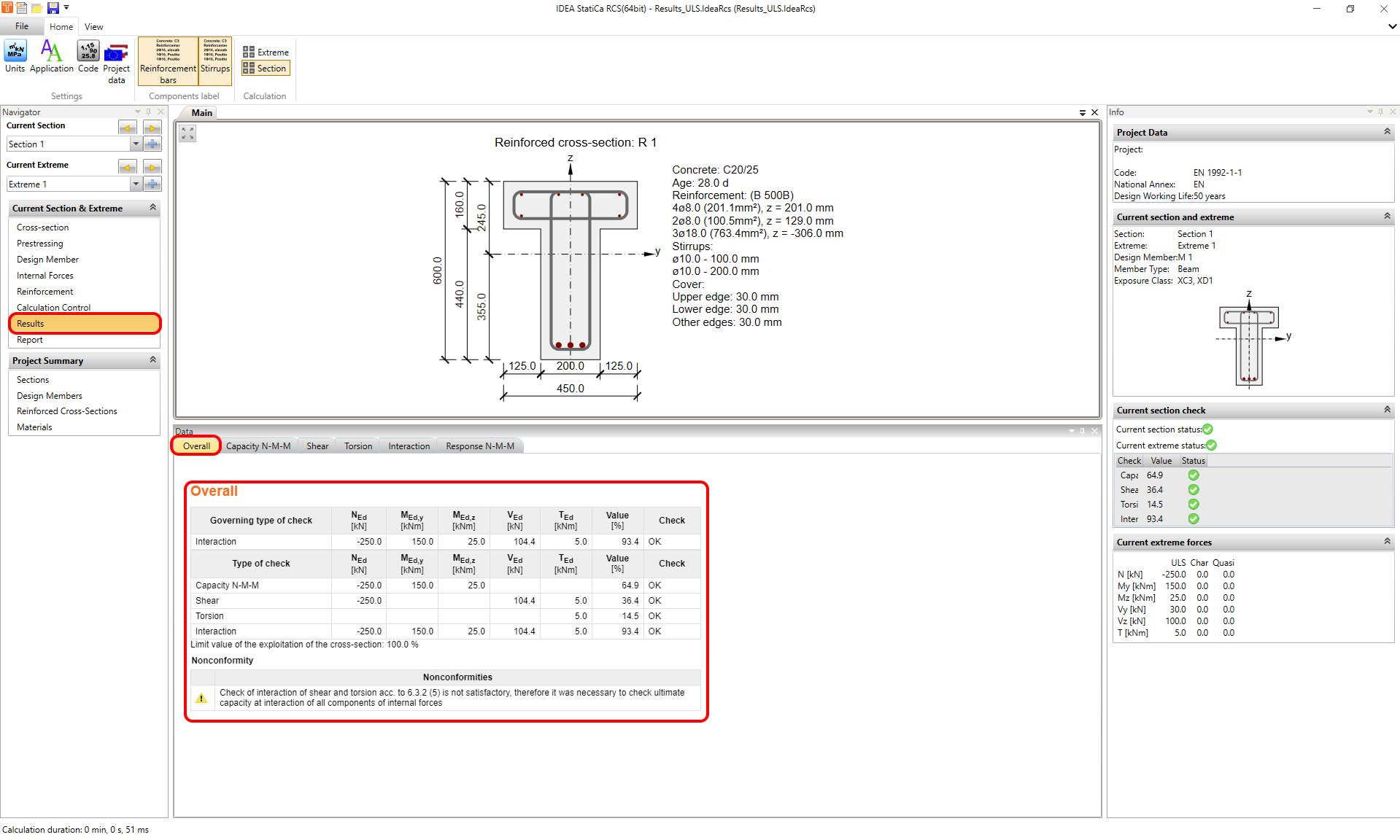 Before we go through them let's look at the Overall result where you can find all selected results (by using calculation control) with corresponding internal forces.