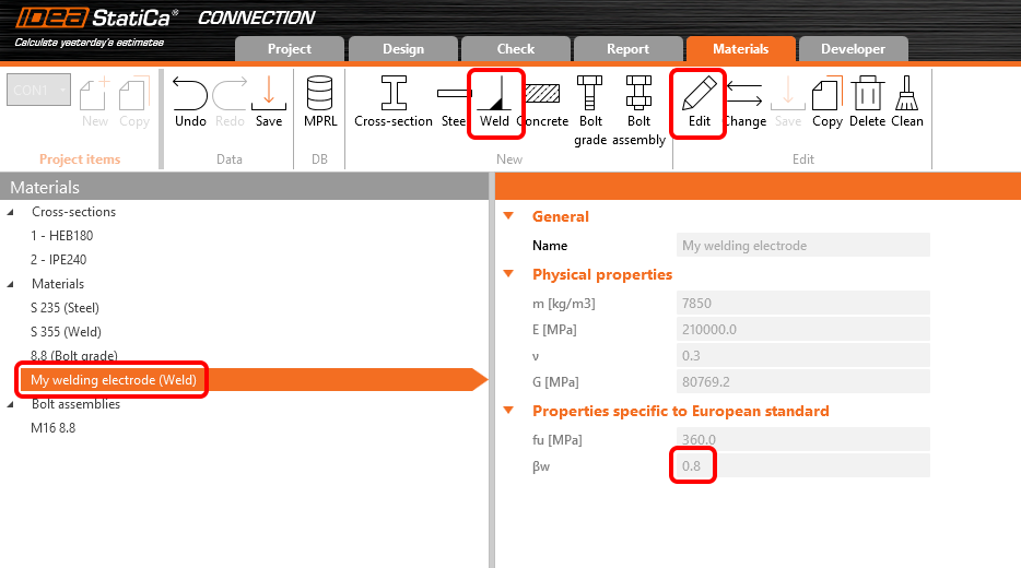 To add a user-defined welding material, go to the tab Materials, add a Weld material, and Edit its properties.