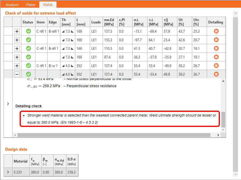 To comply with the standards and to provide safety of the design, the strength value considered in the code check of welds is newly calculated from the strength value of the parent steel for EN and IS standards and the weld material itself.