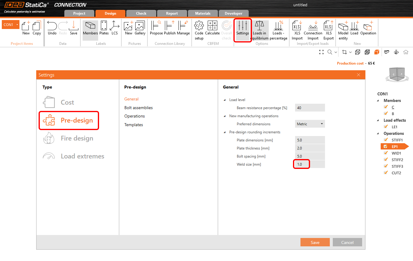 Weld throat thickness or leg size value rounding can be set in Settings, Pre-design, and Weld size.