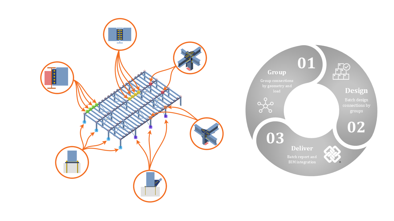 IDEA StatiCa Checkbot is an application that integrates with 20+ global analysis software, such as SAP2000, ETABS, STAAD.Pro, or RISA-3D, to design the connections from the entire structure. Checkbot is a steel connection design hub that allows you to import your structural model, group similar connections, and batch design them based on their geometry.