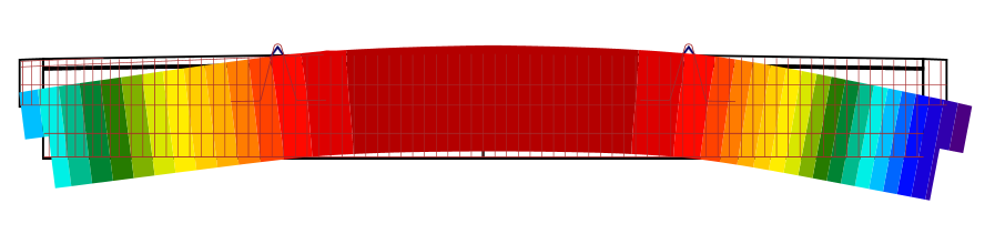 The erecting construction stage may be critical for precast concrete members. This stage can be checked due to the modeling of hanging supports. In the figure, a deformed shape of the precast beam during the erection stage is depicted.
